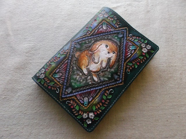 文庫本サイズのブックカバーです。A6サイズの手帳カバーとしてもお使いいただけます。 表装には、刻印を排列したのちに拭き染めで自家染色を施しています。 配列や染色は同じものは二度とできないので、すべて一品物となります。 <革> デザイン面は国産のタンロー(牛革)を使用しています。 タンローとは、タンニンなめしのローケツ染め用革を略したものです。 タンローもヌメ革の一種であり、油分を抜いて染色しやすくしたヌメ革で、拭き染めで染色する本商品には最適の革と言えます。 内側は使い勝手を重視して牛クローム革を採用しています。 <デザイン> 当工房はオンリーワンの革小物をコンセプトにしてデザインしております。 そのため、一枚一枚デザインを変えて刻印を配列し、染料も一枚づつ調合して染色することにこだわっています。 刻印はデザイン性もさることながら、持った時の手触りも考慮して配列しています。 染色も拭き染めという技法を用い、刻印の輪郭を適度にぼかすことで暖かい印象になります。 タンロー自体が油分を抜いて染色しやすくした革であるため、購入されたお客様が日常的に使うことで、艶やしなやかさが増しあじわいがでてきます。 カラー:多色(深緑) モチーフ:ウサギ 袖革:ブラック サイズ:幅24.8cm x 高さ16.5cm(見開き寸法)※600ページを超える場合カバーできない場合が有りますのでお問い合わせください。 ※デザインが複雑な為、特注等のモチーフにご指定される際は再現性のクレームにはお応えできないことがあります。 あらかじめご了承ください。 ※希に他サイトや実店舗で同時期に売れてしまうことがあり、再製作をさせていただくことがあります。 再製作品がNGな方はお手数ですが在庫確認のご連絡を頂ければ幸いです。