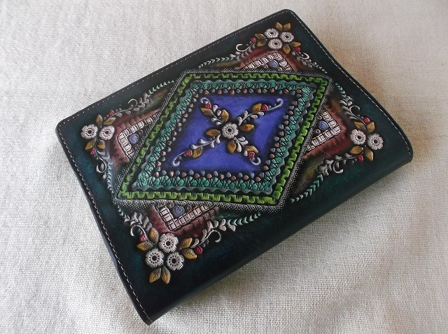 文庫本サイズのブックカバーです。A6サイズの手帳カバーとしてもお使いいただけます。 表装には、刻印を排列したのちに拭き染めで自家染色を施しています。 配列や染色は同じものは二度とできないので、すべて一品物となります。 <革> デザイン面は国産のタンロー(牛革)を使用しています。 タンローとは、タンニンなめしのローケツ染め用革を略したものです。 タンローもヌメ革の一種であり、油分を抜いて染色しやすくしたヌメ革で、拭き染めで染色する本商品には最適の革と言えます。 内側は使い勝手を重視して牛クローム革を採用しています。 <デザイン> 当工房はオンリーワンの革小物をコンセプトにしてデザインしております。 そのため、一枚一枚デザインを変えて刻印を配列し、染料も一枚づつ調合して染色することにこだわっています。 刻印はデザイン性もさることながら、持った時の手触りも考慮して配列しています。 染色も拭き染めという技法を用い、刻印の輪郭を適度にぼかすことで暖かい印象になります。 タンロー自体が油分を抜いて染色しやすくした革であるため、購入されたお客様が日常的に使うことで、艶やしなやかさが増しあじわいがでてきます。 カラー:多色(緑、青) モチーフ: 袖革:ブラック サイズ:幅24.8cm x 高さ16.5cm(見開き寸法)※600ページを超える場合カバーできない場合が有りますのでお問い合わせください。 ※デザインが複雑な為、特注等のモチーフにご指定される際は再現性のクレームにはお応えできないことがあります。 あらかじめご了承ください。 ※希に他サイトや実店舗で同時期に売れてしまうことがあり、再製作をさせていただくことがあります。 再製作品がNGな方はお手数ですが在庫確認のご連絡を頂ければ幸いです。