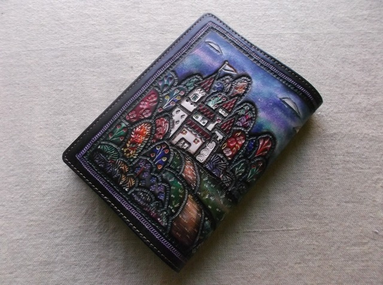 表装には、刻印を排列したのちに拭き染めで自家染色を施しています。