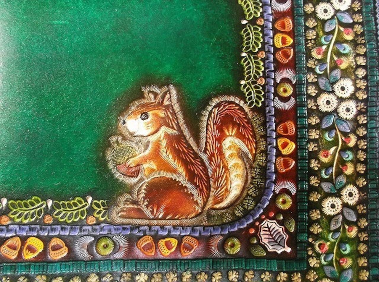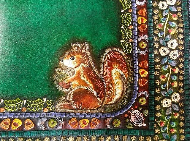 白革に刻印を配列し、拭き染めという技法で自家染色しました。