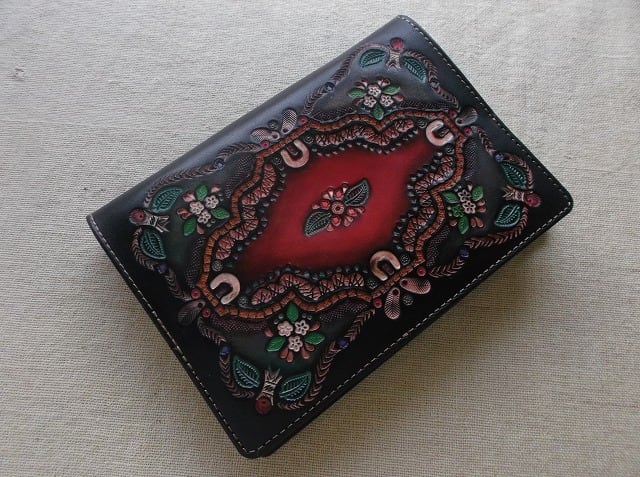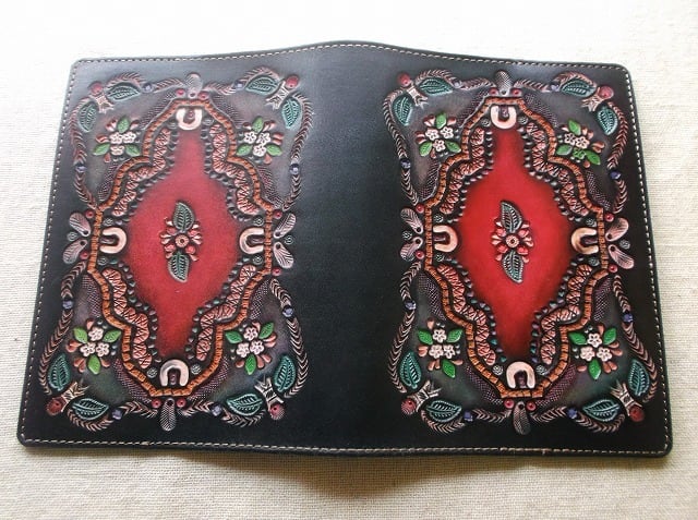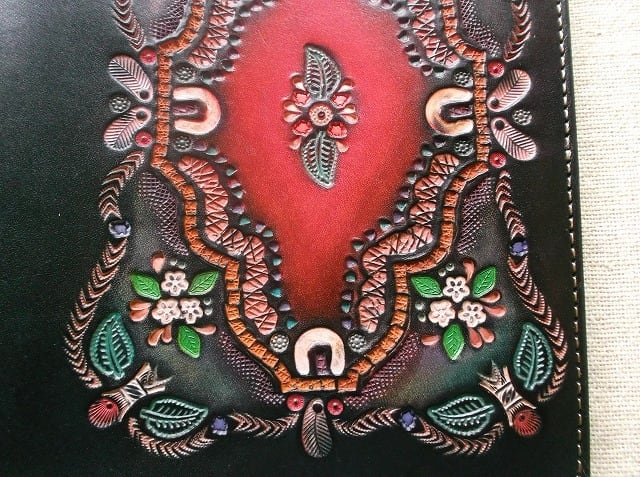 表装には、刻印を排列したのちに拭き染めで自家染色を施しています。