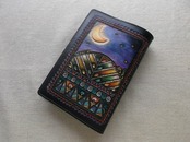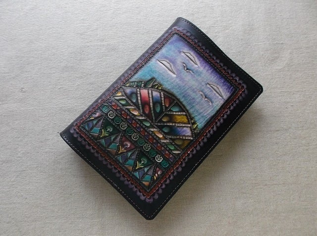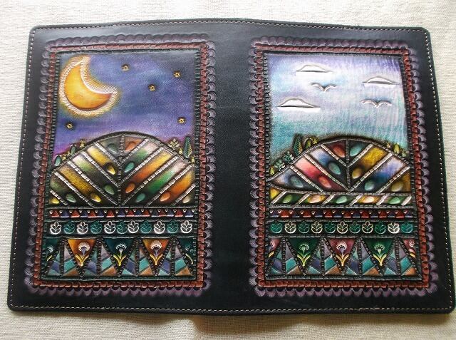 白革に刻印を配列し、拭き染めという技法で自家染色しました。