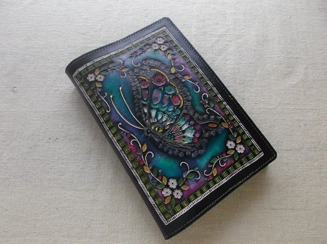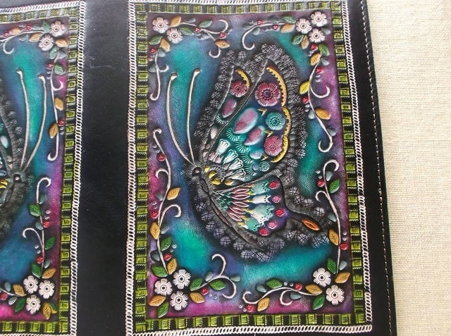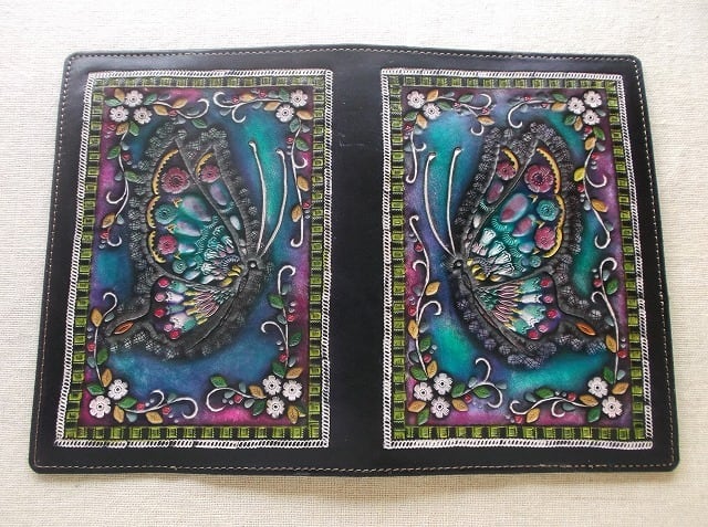 白革に刻印を配列し、拭き染めという技法で自家染色しました。
