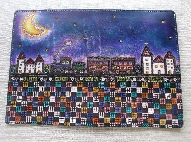 白革に刻印を配列し、拭き染めという技法で自家染色しました。