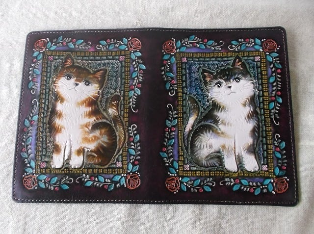 表装には、刻印を排列したのちに拭き染めで自家染色を施しています。