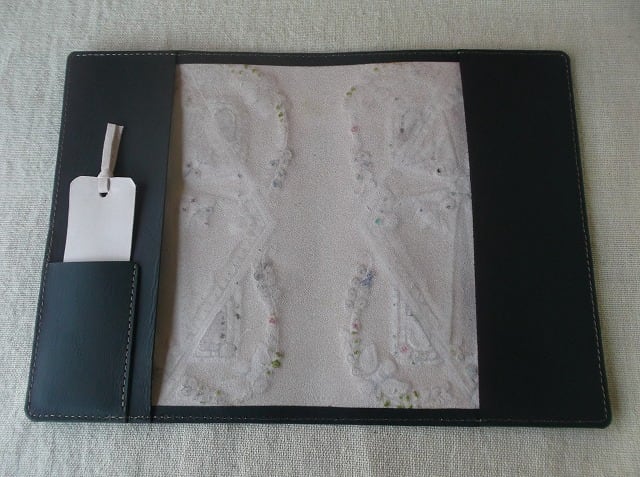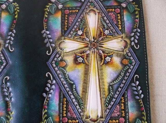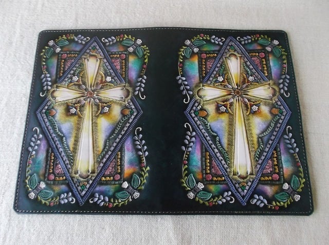 白革に刻印を配列し、拭き染めという技法で自家染色しました。