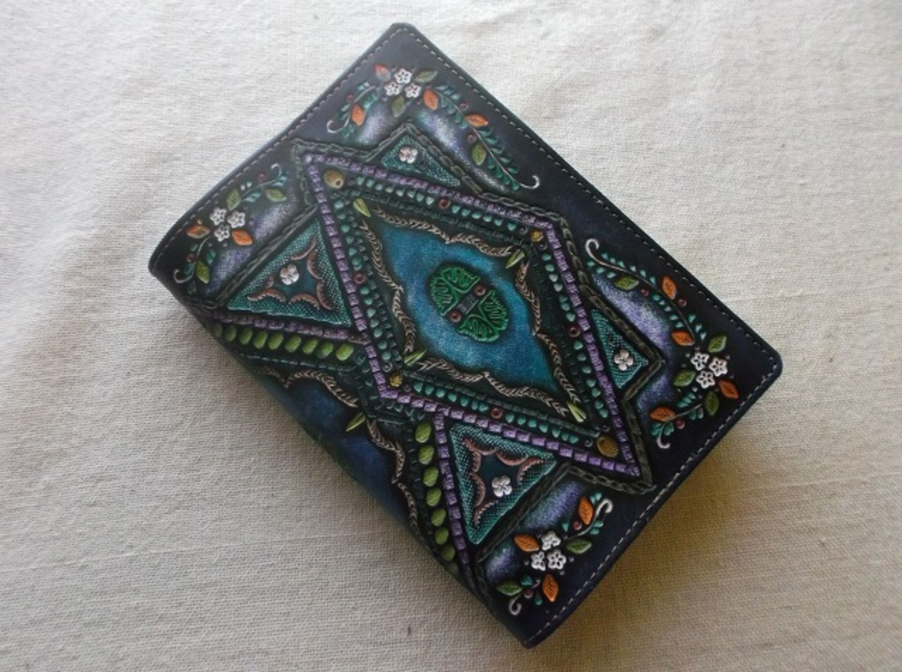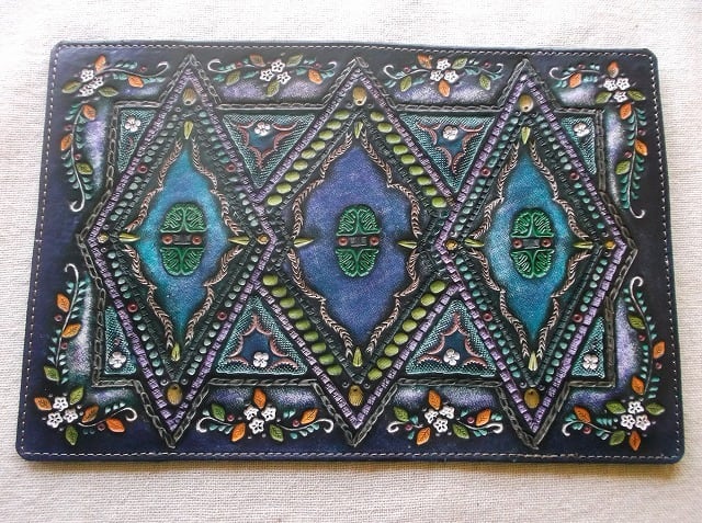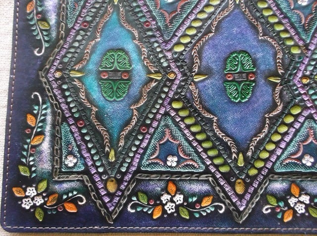 表装には、刻印を排列したのちに拭き染めで自家染色を施しています。