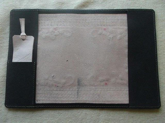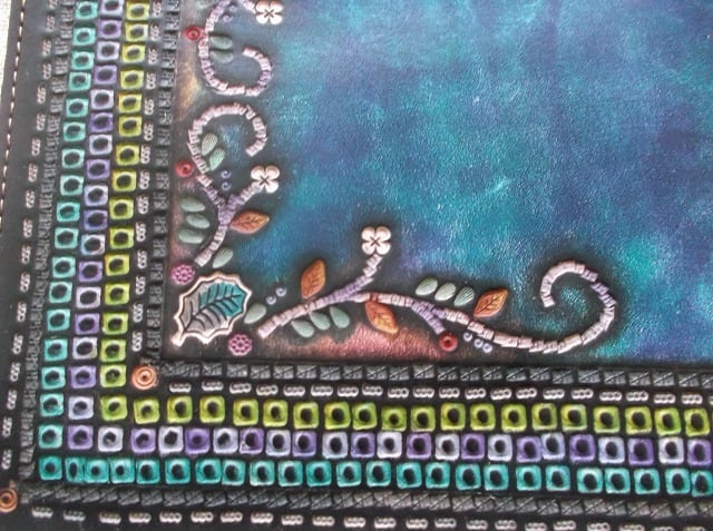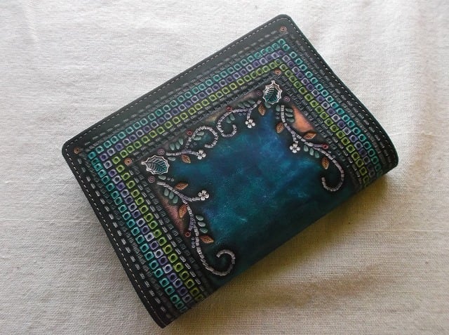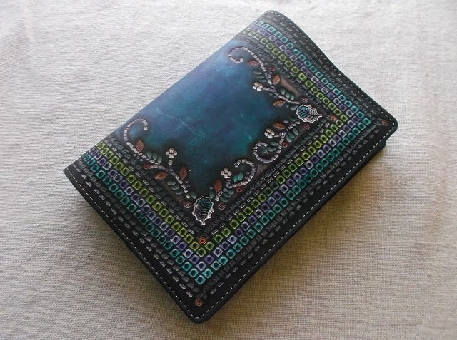 表装には、刻印を排列したのちに拭き染めで自家染色を施しています。
