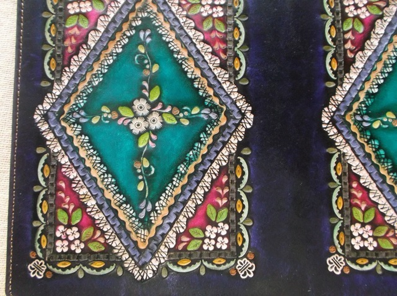 表装には、刻印を排列したのちに拭き染めで自家染色を施しています。
