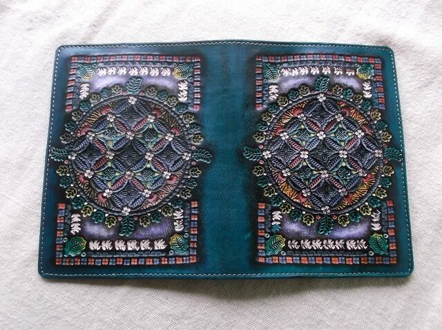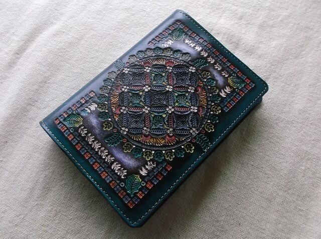表装には、刻印を排列したのちに拭き染めで自家染色を施しています。