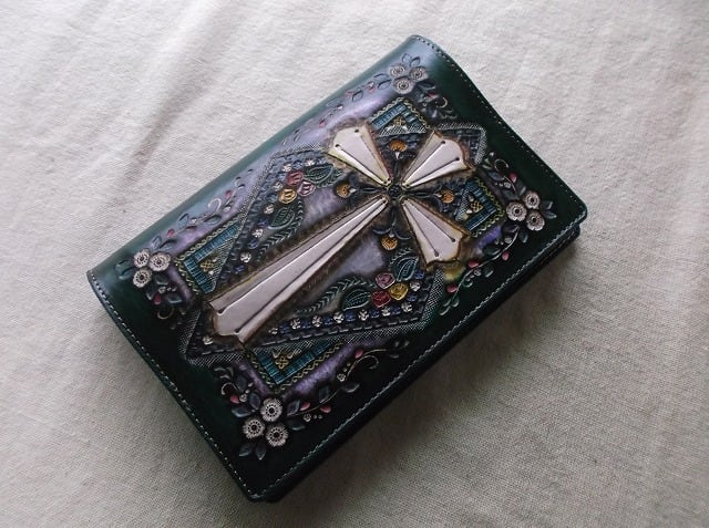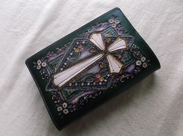 白革に刻印を配列し、拭き染めという技法で自家染色しました。