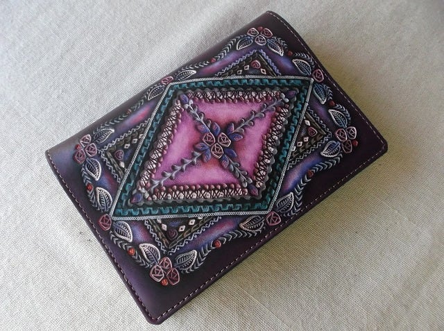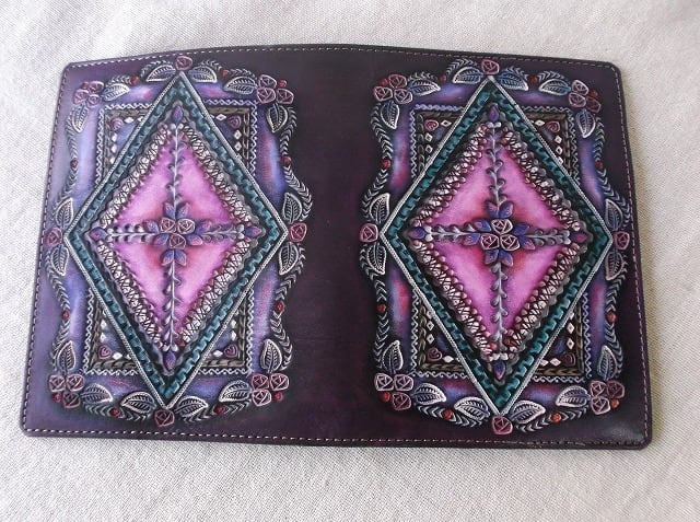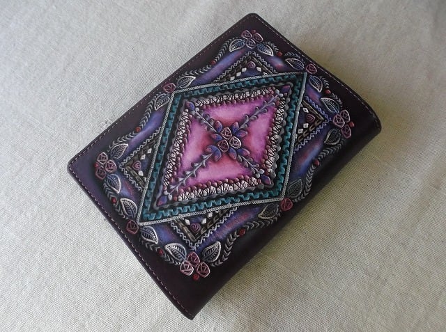 表装には、刻印を排列したのちに拭き染めで自家染色を施しています。