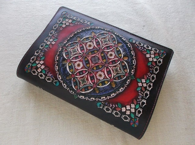 刻印配列や染色はさることながら、使い込むほどに、経年変化で艶が増しより使いやすくなることがほかの素材のブックカバーにはない最大の特徴だと思います。