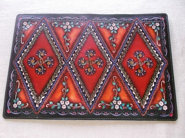 タンローに刻印を配列し、拭き染めという技法で自家染色しました。