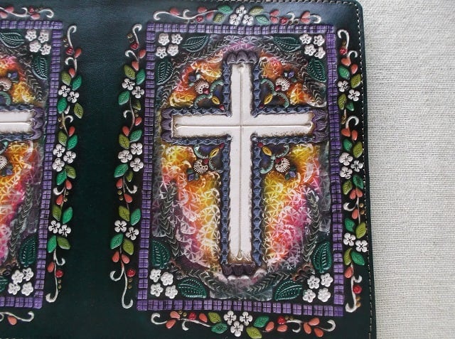 表装には、刻印を排列したのちに拭き染めで自家染色を施しています。