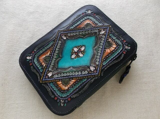 牛タンロウ革に刻印デザインを排列して染色を施しました。