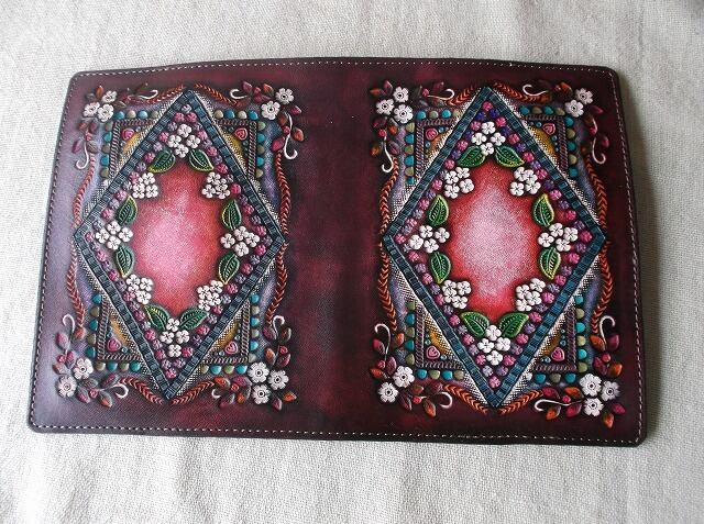 表装には、刻印を排列したのちに拭き染めで自家染色を施しています。