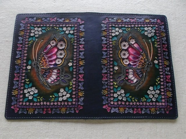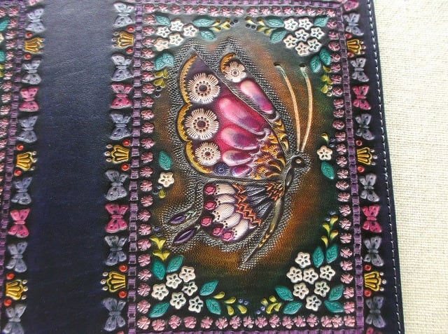 表装には、刻印を排列したのちに拭き染めで自家染色を施しています。