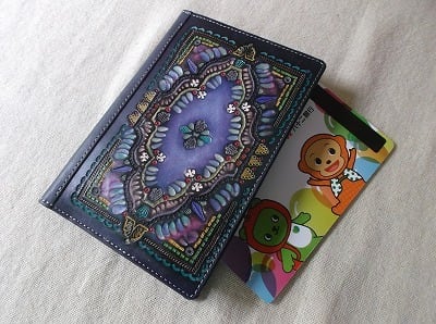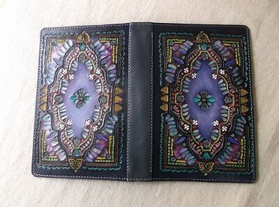 表装はタンニン鞣しの本革にクラフトを施し自家染色で染め上げたオンリーワンのデザイン。しっとりとした本革の質感が魅力です。内側はカードポケットも豊富に備えており、必要なものをスムーズに取り出すことができます。